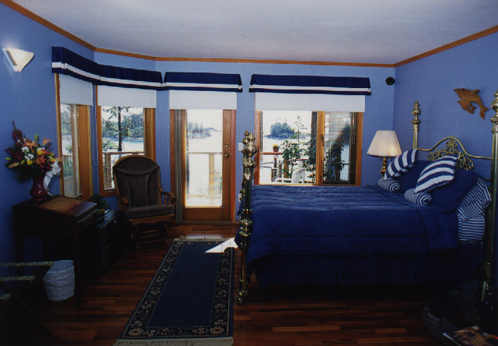 Bed, rich blue colours against hardwood floors in a nautical theme fit for